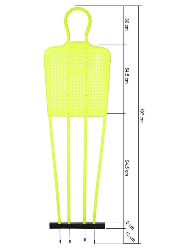 Celoplastová figurína Defence Mannequin s výškou 180 cm a hmotnosťou 3,5 kg slúži na nácvik presnosti priamych kopov, nácvik herných situácií pri zahrávaní pokutových kopov a zároveň aj ako tréningová pomôcka pre futbalových brankárov pri týchto situáciách. Tréningová figurína Defence Mannequin v výraznej neónovo žltej farbe je vybavená štyrmi oceľovými 13 cm dlhými bodcami pre stabilné ukotvenie do trávnatého ihriska. Táto užitočná pomôcka by mala byť súčasťou tréningovej výbavy každého futbalového klubu. Pre používanie figuríny na umelom alebo inom pevnom povrchu môžete zakúpiť stojan Defence Mannequin Base. Podrobné rozmery tréningovej figuríny nájdete vo fotogalérii.859179265118865.38