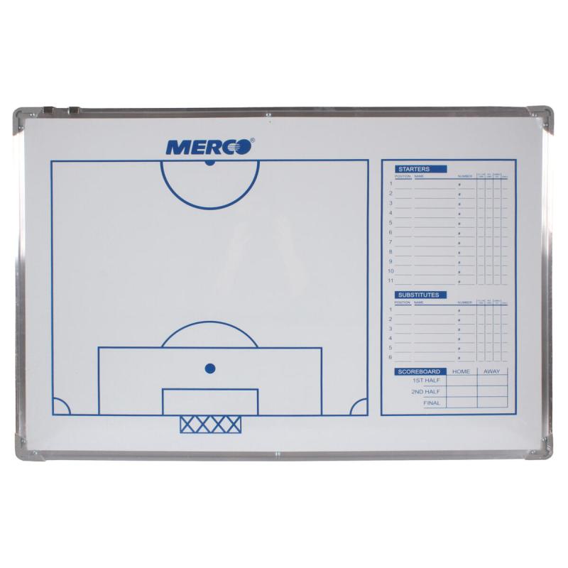 Fotbalová trenérská tabule je užitečným asistentem trenérů napříč všemi soutěžemi. Taktická tabule Merco Football 90 je magnetická deska se dvěma sadami magnetů pro plánování a analýzu výkonů hráčů.Oboustranně magnetická tabule zobrazuje fotbalové hřiště na jedné straně. Na druhé straně je ze dvou třetin znázorněná polovina hřiště a tabulka pro soupisku hráčů. Součástí tabule Football 90 jsou dvě sady číslovaných magnetů 1 – 11 a čtyři další magnety reprezentující rozhodčí a míč, součástí je také černý popisovač a houbička pro detailnější popis herní strategie. Tabule je usazená v aluminiovém rámu s rozměry 90 x 60 x 2 cm a má hmotnost přibližně 2 kg. Na horním okraji tabule jsou dva háčky pro případné zavěšení na zeď.