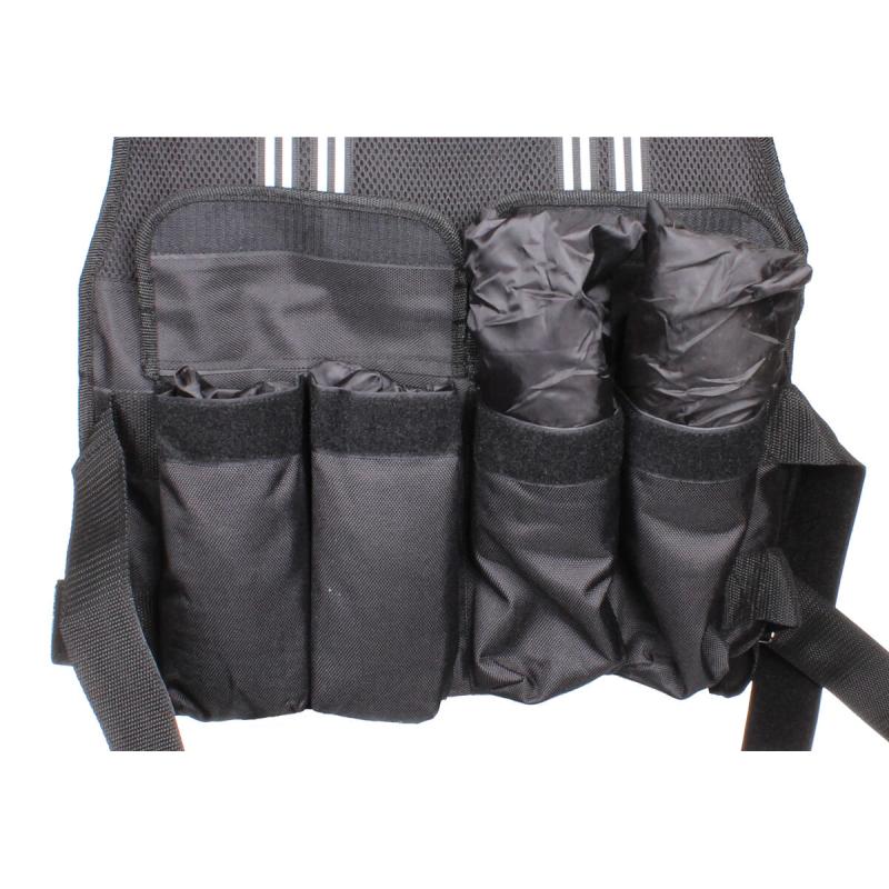 O zátěž vesty se starají rovnoměrně rozmístěné sáčky s pískem, aby nedocházelo k jednostrannému zatížení těla a vesta dobře seděla i při maximální zátěži (10 nebo 20 kg) a nejnamáhavějších aktivitách. Jednoduchým vyjmutím, nebo doplněním jednotlivých sáčků, si můžete upravit celkovou hmotnost tak, aby přesně odpovídala potřebám Vašeho tréninku.