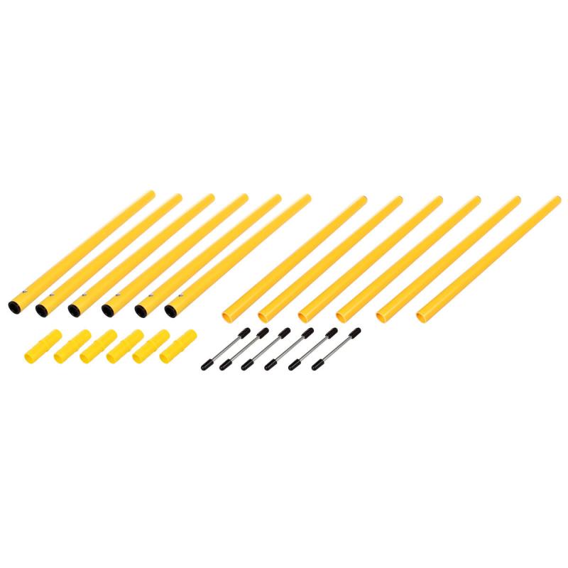 Z jednotlivých dílů, které sada obsahuje, jednoduše složíte až 6 tyčí z PVC o délce 100 cm a průměru 2,5 cm. Každá tyč je vybavena kovovým bodcem o délce 11 cm, který umožňuje pevné zapíchnutí do země.