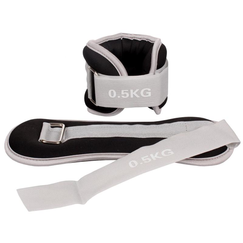Sada dvou závaží na zápěstí a kotníky s hmotností 0,5 kg každý, vyrobená z neoprenu s pískovou výplní, vhodná pro posilování, aerobik i běh. zobrazit celý popis