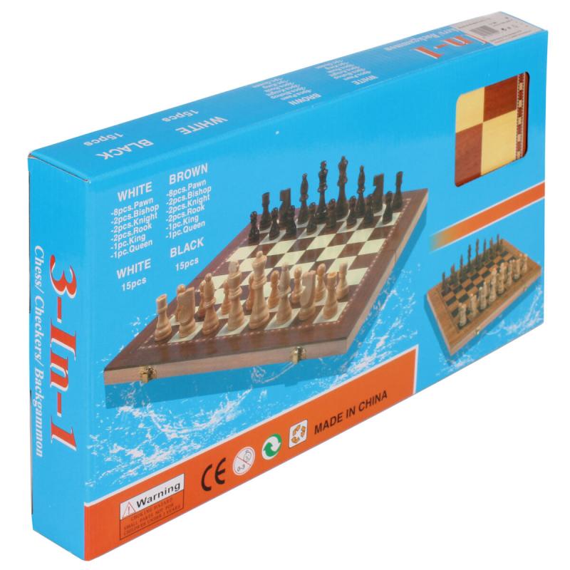 Praktická sada 3v1 s dřevěnou skládací deskou a figurkami pro šachy, dámu i backgammon. Lehká a skladná, ideální na cesty i domácí hraní.Zahrajte si klasické stolní hry jako šachy, dámu nebo backgammon doma i na cestách díky této praktické sadě 3v1. Skládací deska o rozměrech 39 x 39 x 2 cm je vyrobena z kvalitního borovicového dřeva s doplňky z třešně, což zaručuje příjemný přírodní vzhled a odolnost při častém používání.