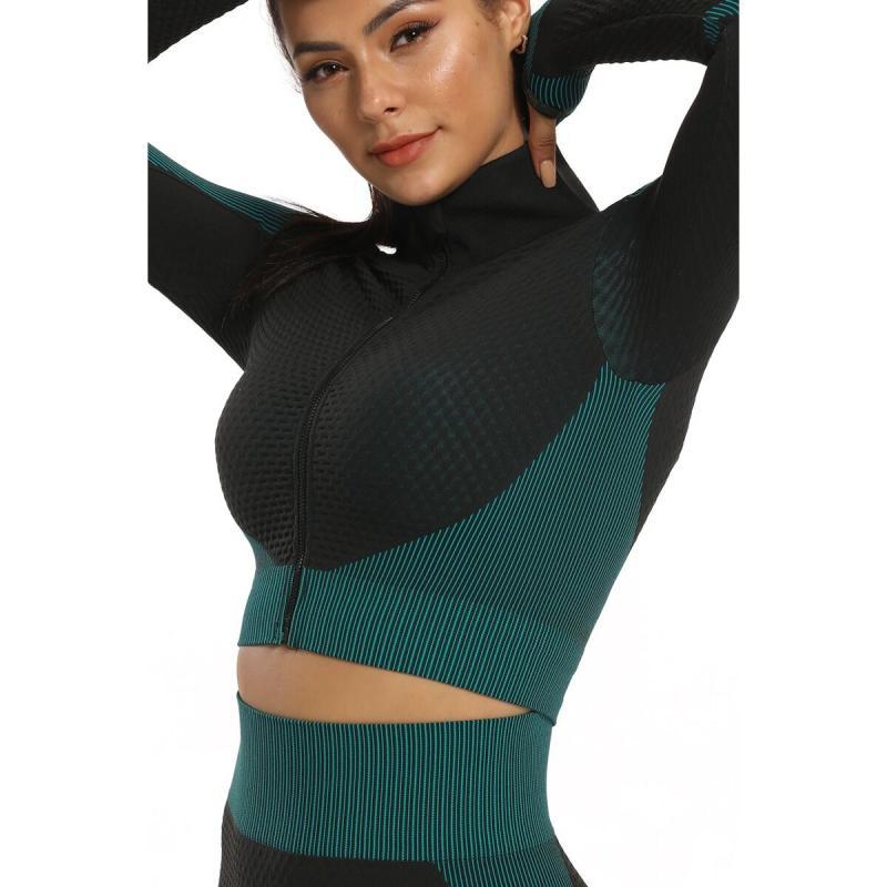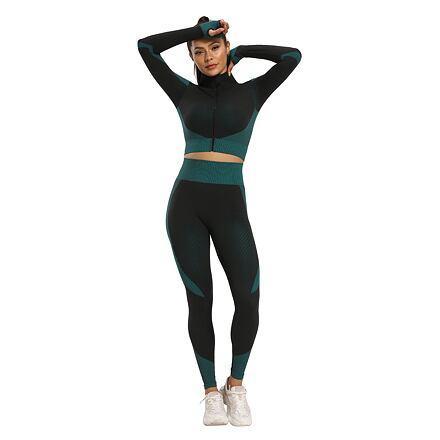 Sada dámského sportovního oblečení Yoga Sense fitness set se skládá ze tří kusů - sportovní podprsenky, krátké mikiny se stojáčkem a zapínáním na zip a dlouhých legín. Podprsenka má vykrojená ramínka na zádech a vyjímatelné košíčky. Mikina ve stylu crop top má dlouhý rukáv s otvorem pro palec. Zobrazit celý popis