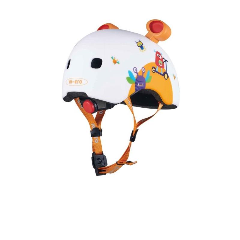 Bezpečná prilba značky Micro s nastaviteľnou veľkosťou pomocou upínacieho kolieska. Jedná sa o 3D prilbu s dizajnom príšeriek.