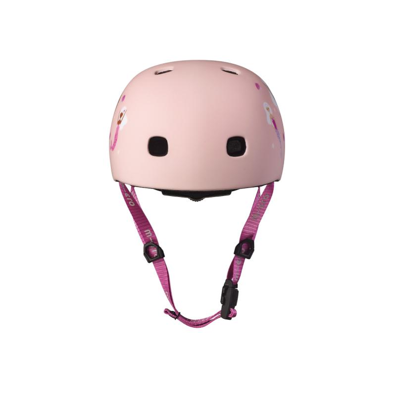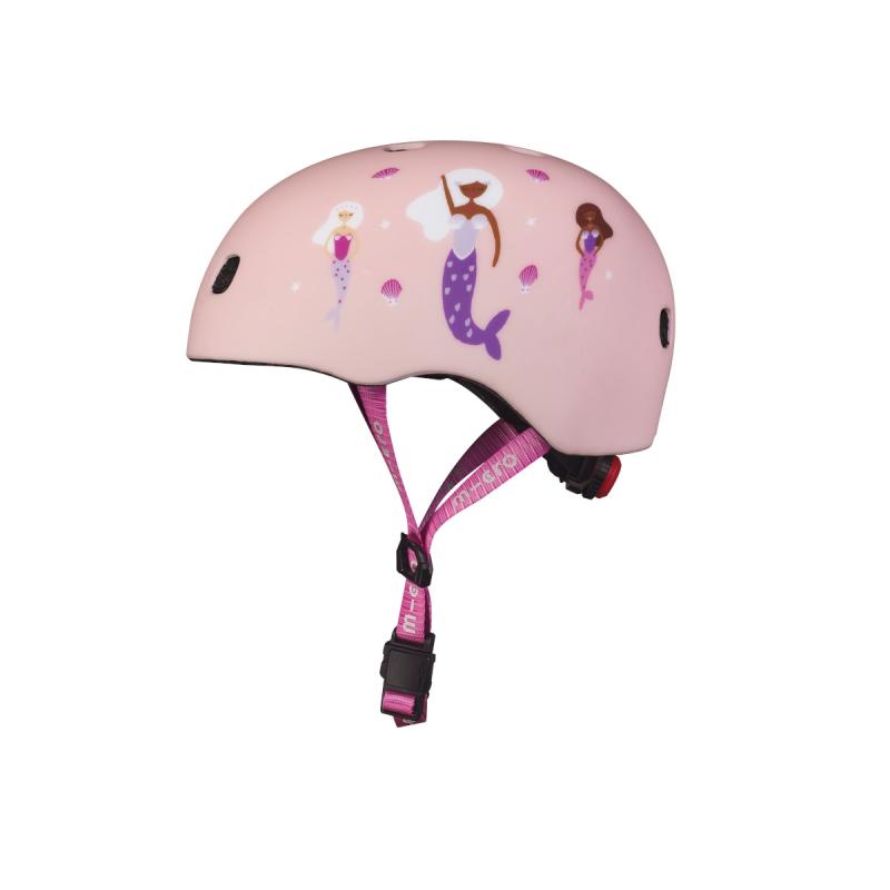 Bezpečná prilba značky Micro s nastaviteľnou veľkosťou pomocou upínacieho kolieska. Jedná sa o prilbu v matnej ružovej farbe s motívom morskej panny.Prilba je vhodná na jazdu na kolobežke, detskom odrážadle, kolieskových korčuliach a skateboarde.