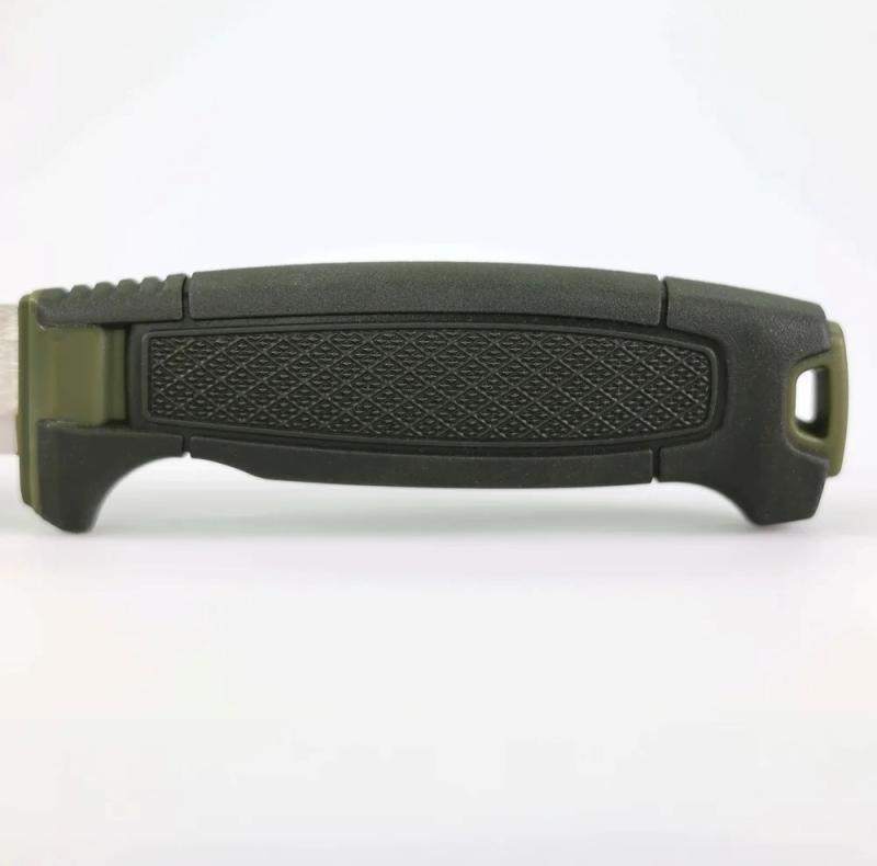 V horní části rukojeti je praktický závěsný otvor, díky kterému můžete nůž připevnit pomocí karabiny, provázku nebo paracordu podle potřeby a způsobu využití. Součástí je plastové pouzdro, které lze orientovat doprava i doleva, je snadno omyvatelné a má otvory ve špičce pro odtok vody. Pouzdro je vyrobené z pevného polymeru, který poskytuje spolehlivou ochranu čepele.