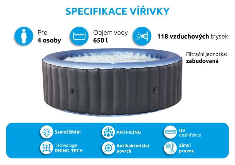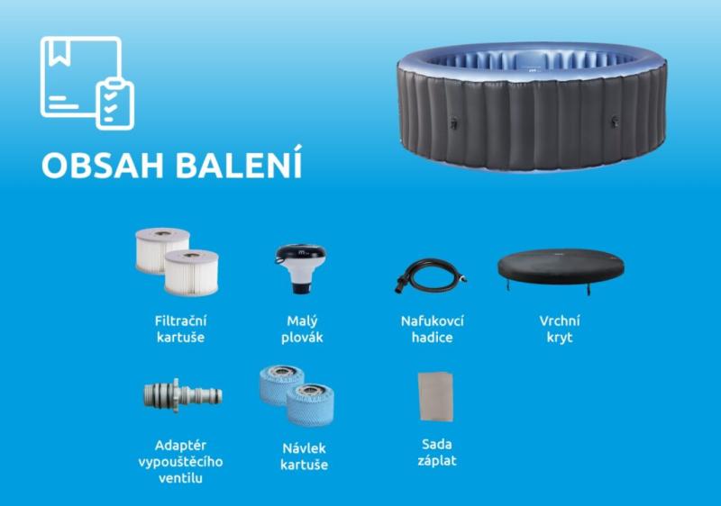 Prevádzka vírivky je garantovaná až do teploty -5 °C. Nízke teploty sú prispôsobené ako materiály vírivky a ovládacích prvkov, tak aj funkcie v spojení s prevádzkovými procesmi systému. Pre dokonalý pôžitok z relaxácie v zime stačí vírivku udržiavať aktivovanú a ak sa nepoužíva, zakryť ju plášťovým i nafukovacím krytom. Pri poklese vonkajšej teploty pod 0 °C je pred nafúknutím potrebné nechať plášť vírivky aklimatizovať v teplej miestnosti po dobu 24 hodín. Po prenesení vírivky von, je potrebné ju ihneď nafúknuť, napustiť vodou a zapnúť ohrev. Vo veľkom mraze neodporúčame dlhodobé používanie vírivky vonku. Príslušenstvo SPA (obsiahnuté v balení vírivky):- vírivá vaňa s káblovým diaľkovým ovládačom
