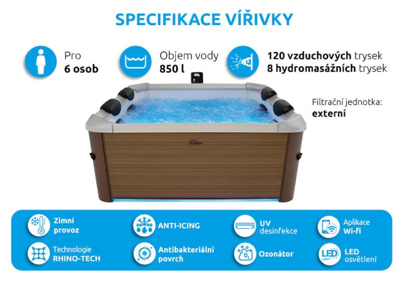 - Trysky:120 vzduchových + 8 nastaviteľných hydromasážnych trysiek