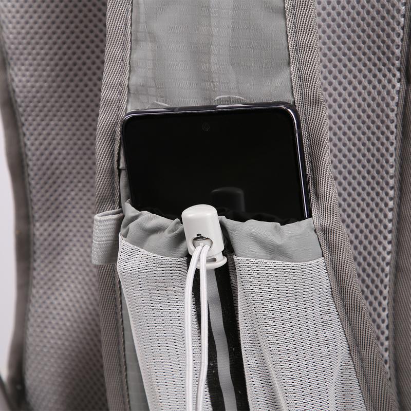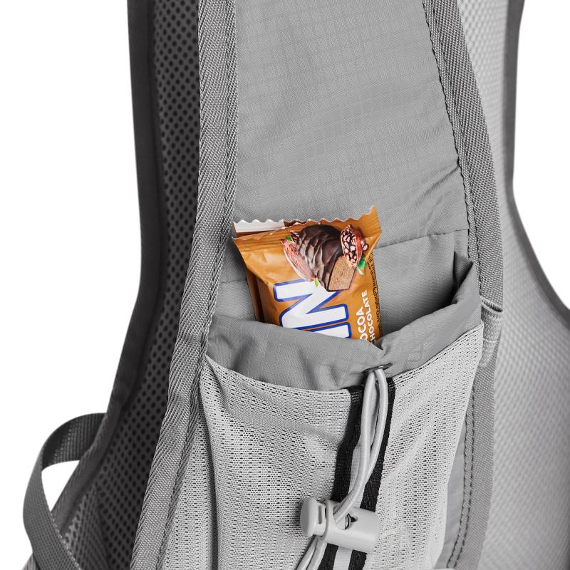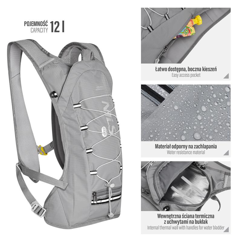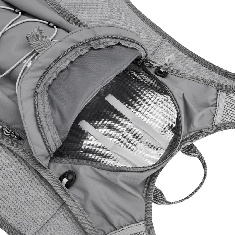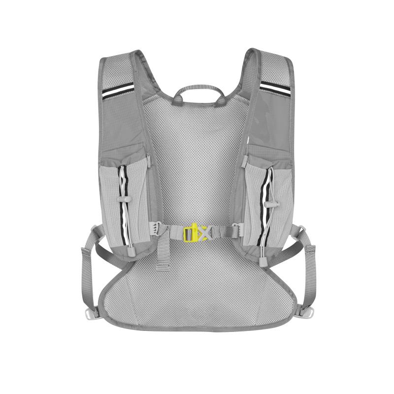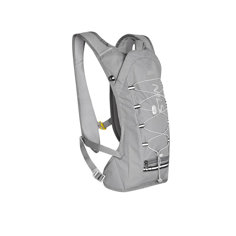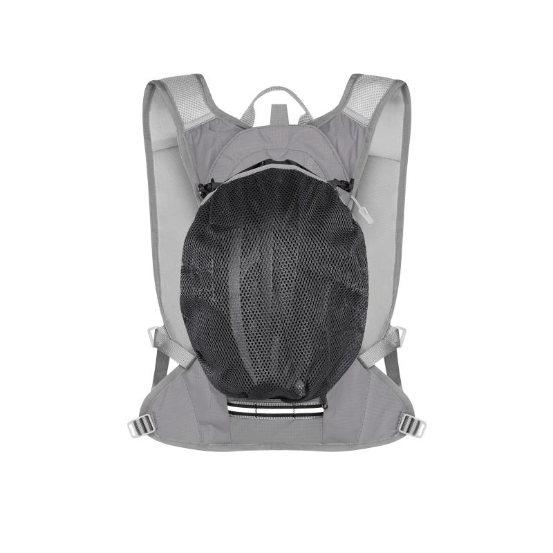 Hlavní komora batohu je opatřena přepážkou, v horní části se nachází 2 suché zipy pro zavěšení hydrovaku (není součástí dodávky). Zadní strana hlavní komory je opatřena hliníkovou fólií, která slouží jako izolace mezi hydrovakem a zády, takže nápoj se nebude ohřívat teplem od zad. Hadičku hydrovaku lze vyvést průvlaky na pravé i na levé straně pod ramenními panely. Přední strana batohu je opatřena gumovým lankem s brzdičkou, pod které lze uložit například karimatku. Níže nalezneme kapsu, ve které se skrývá síťka, kterou lze vytáhnout a pomocí karabinek připnout ke stranám batohu, síťka následně vytvoří kapsu, co které můžeme uložit například cyklistickou helmu, ešus apod.. Pod kapsou je reflexní panel, ke kterému si můžeme připnout další vybavení. Na pravé straně se skrývá další kapsa na zip, která je ideální pro telefon, peněženku, nebo například klíče. Na horní straně batohu je poutko pro snadné přenášení batohu v ruce. Záda a ramenní popruhy jsou vyrobeny ze síťoviny doplněné o prodyšnou pěnu, která zvyšuje prodyšnost panelu a záda se budou méně potit. Ramenní popruhy jsou opatřeny reflexními řemínky pro protažení hadičky od hydrovaku a kapsami ze síťoviny. Na levém popruhu se navíc nachází kapsička s průhlednou čelní stranou, do které lze uložit například kartičku pro případ ztráty, startovní číslo a podobně. Ramenní popruhy jsou spojeny hrudním pásem, který lze výškově nastavit. Popruh je spojen plastovou přezkou s píšťalkou.