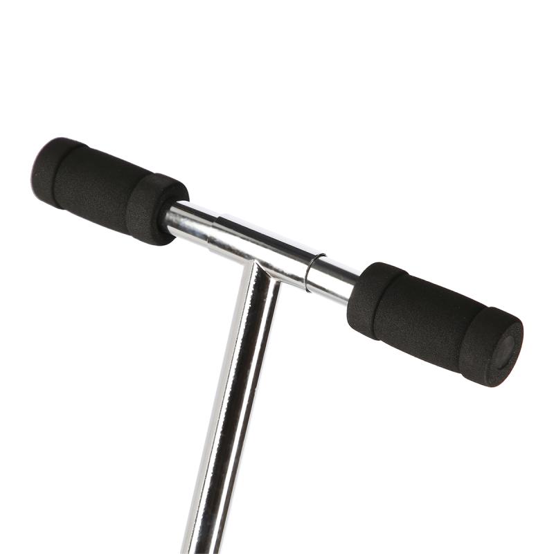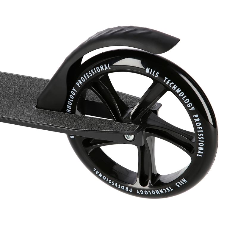 Zadní blatník slouží jako nášlapná brzda. Sklopná řídítka jsou opatřeny pěnovými rukojeťmi, které zajišťují pevný a pohodlný úchop. Řídítka jsou výškově nastavitelná do 3 úrovní. Velká kola jsou osazena ložisky ABEC 7 a polyuretanovou pneumatikou o průměru 200 milimetrů. Tato kombinace zajišťuje rychlou, plynulou a bezpečnou jízdu. Sklopný stojánek umožňuje postavení koloběžky, tekže ji není potřeba pokládat.