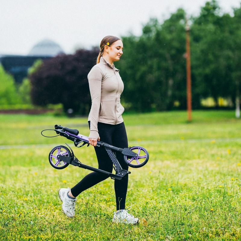 Díky velkým polyuretanovým kolečkům o průměru 200 mm a ložiskům ABEC 7 poskytuje koloběžka mimořádně hladkou jízdu. Perfektně funguje na asfaltu i zpevněných chodnících, zaručuje pohodlí a minimalizuje vibrace i na nerovném povrchu.