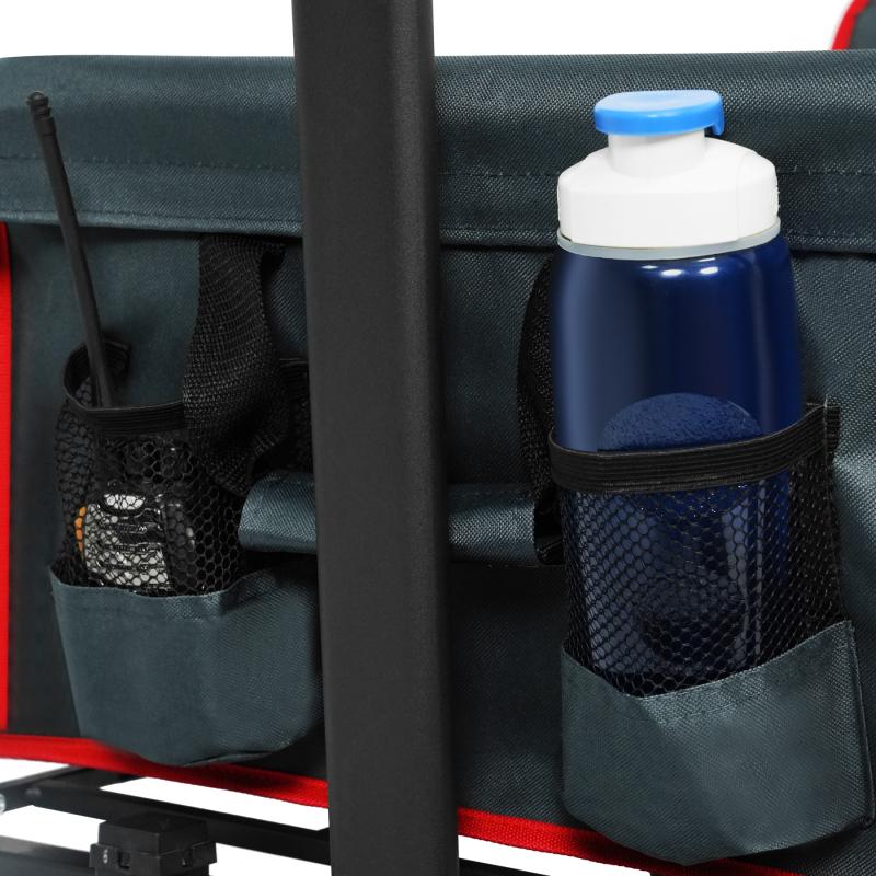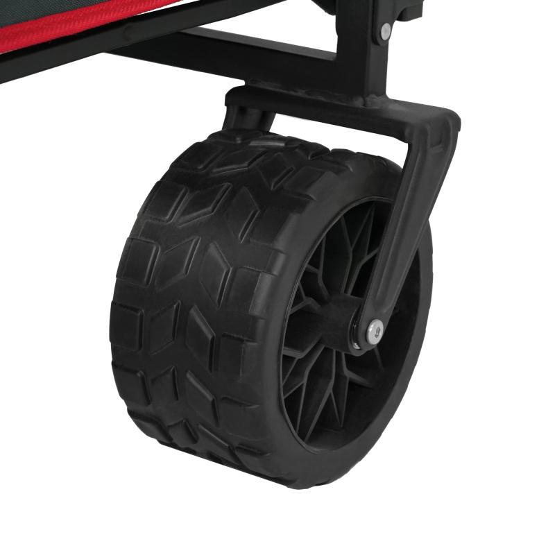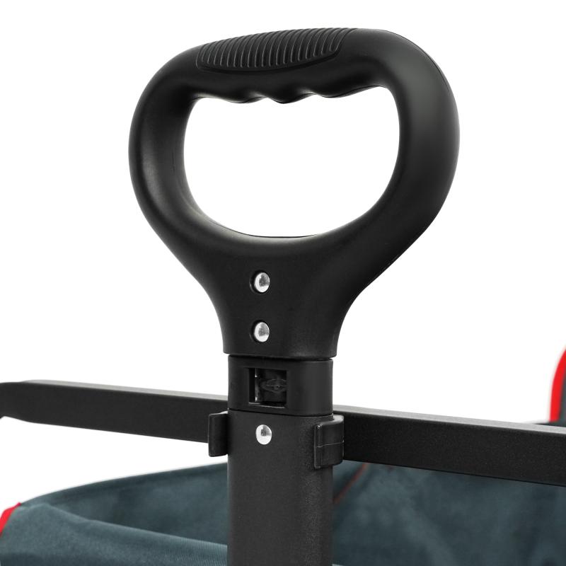 Vozík je navrhnutý s dôrazom na pohodlie. Má nastaviteľné madlo, ktoré je možné prispôsobiť výške používateľa a zabezpečiť tak ergonomické a pohodlné vedenie. Veľké široké kolesá s rozmermi 18 x 10 cm vyrobené z kombinácie polypropylénu a PVC zvládajú bez problémov rôzne povrchy – asfalt, trávu aj piesok. Zadnú stenu je možné skloniť a uložiť tak napríklad dlhšie predmety. Predné kolesá sú vybavené brzdami pre zaistenie vozíka na mieste.