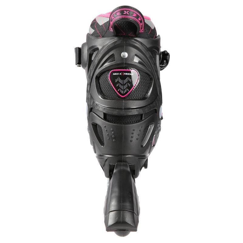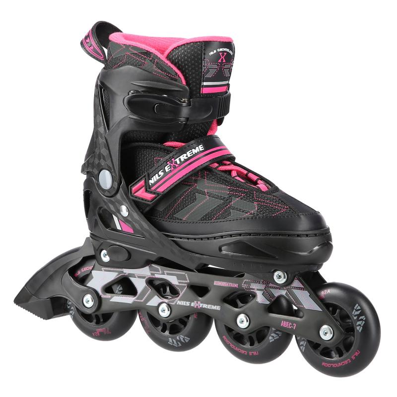 Kolečkové brusle NILS Extreme NA11002 jsou určeny k rekreační jízdě začínajících a mírně pokročilých bruslařů po rovných a hladkých stezkách, jako například po asfaltu. Lehká a odolná bota zajišťuje bezpečnost při jízdě. Systém ventilace a tvarovaná stélka boty přímo ovlivňují zvýšení uživatelského komfortu. Jedná se o model s nastavitelnou velikostí, kdy každá brusle má na výběr ze 4 rozměrů. Pomocí jednoduchého řídicího systému lze snadno a rychle nastavit velikost boty na noze uživatele. Kolečka s tvrdostí 82A jsou uložena v hliníkové liště, dobře přiléhají k podkladu a částečně pohlcují nervnosti. Model NA11002 je osazen ložisky ABEC 7, která se vyznačují precizním zpracováním a nízkým odporem, kdy jízda má dobrou setrvačnost a na bruslích tak lze urazit dlouhou vzdálenost bez vynaložení zbytečné síly.