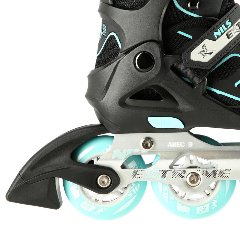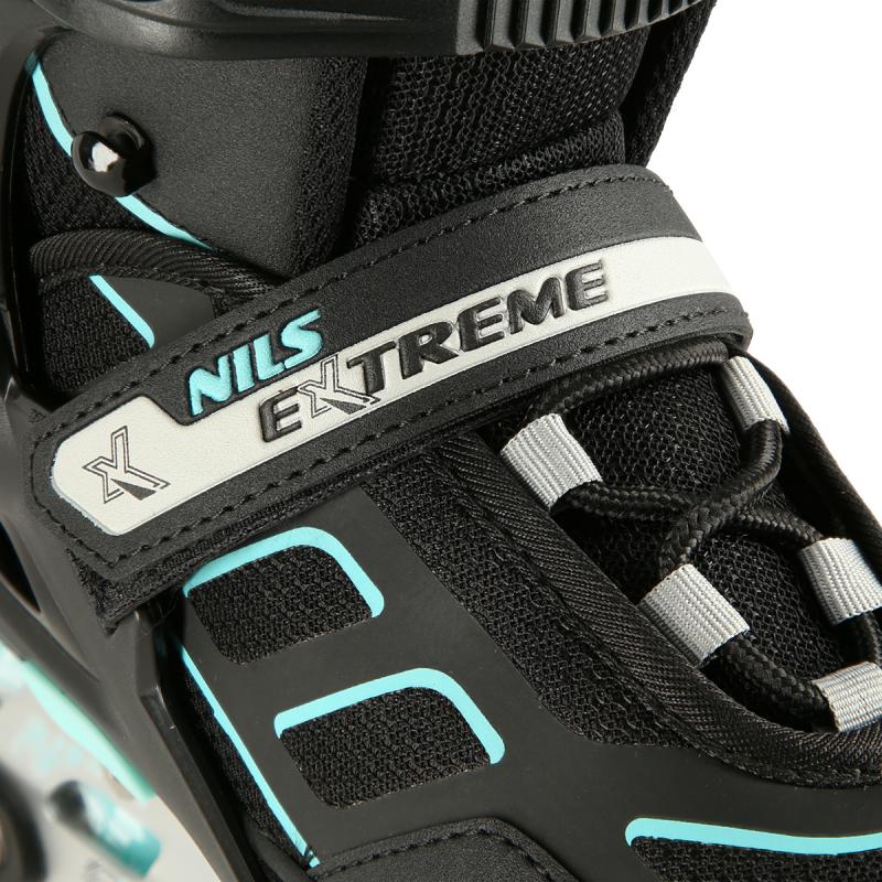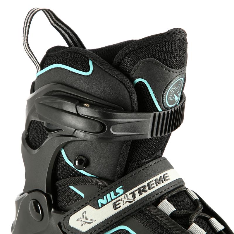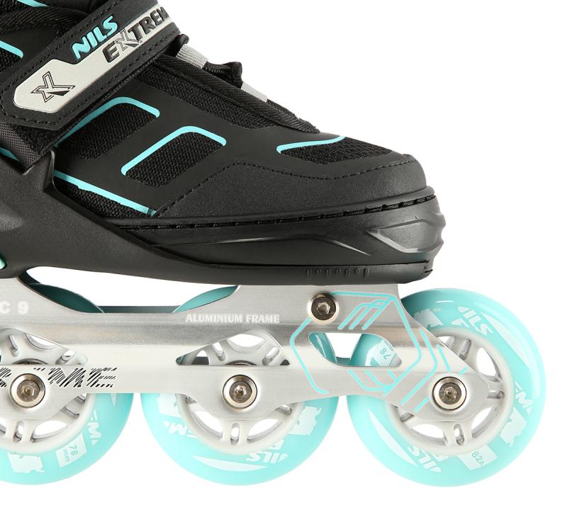 Kolečkové brusle NILS Extreme NA14174 jsou vhodné k rekreační jízdě po tvrdém a rovném povrchu. Podvozek brusle je vyroben z hliníku a je osazen PU kolečky o tvrdosti 82A s ložisky ABEC 9. Poloměkká bota je vyrobena z polypropylenu, který je velice odolný. Vložka je profilovaná a prodyšná. Brusle je možné pomocí stisku tlačítka a posunutí přední částí boty nastavit do jedné ze čtyř velikostí. Zapínání je řešeno klasickou trojkombinací (dvousekční přezka, pásek se suchým zipem a šněrování). Model NA14174 je určen pro začínající a středně pokročilé bruslaře.