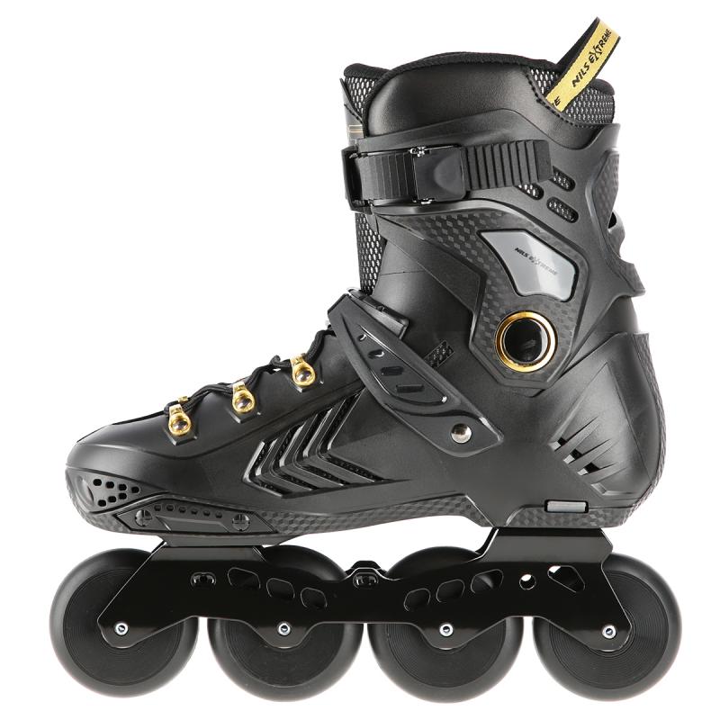 Kolieskové korčule NILS Extreme NA20002 sú určené primárne pre freeride a slalom. Ich konštrukcia je založená na ľahkej, vetranej topánke s anatomickou stielkou zaručujúcou vysokú stabilitu päty, polypropylénovom skelete a hliníkovej lište vyrobenej pomocou vstrekovania. Ako zapínanie bolo použité šnurovanie, dvojsekčné pracky a kvalitné spony s napínacím mechanizmom. Na vonkajšej strane topánky nájdeme slider, tak často používaný pri freeride.