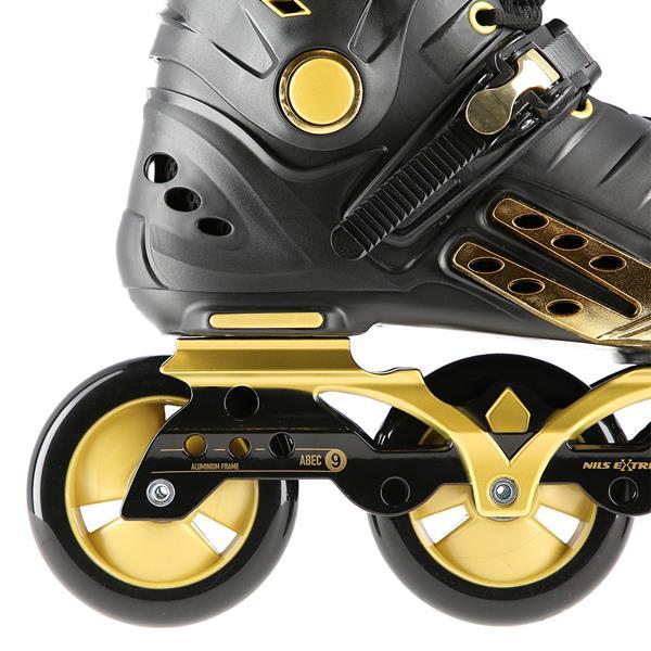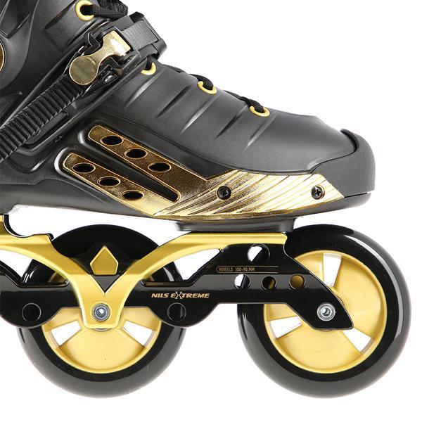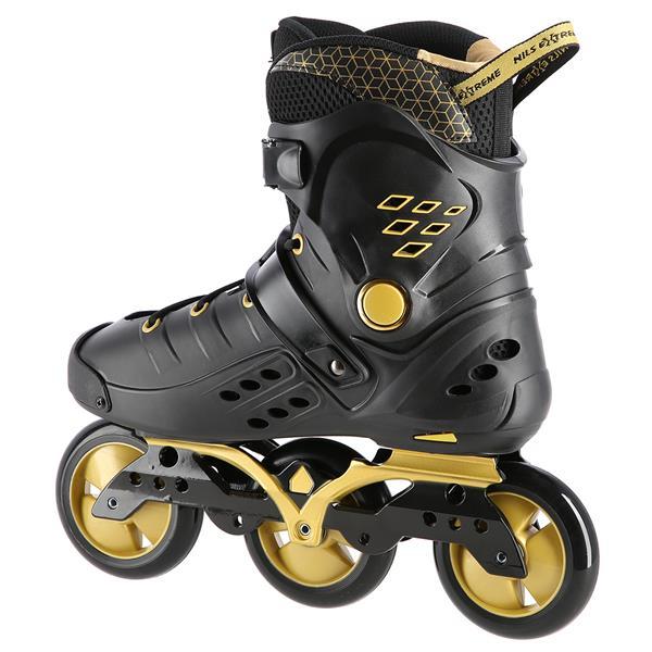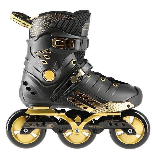 NILS Extreme NA20006 sú freeridové korčule určené pre stredne pokročilých a pokročilých korčuliarov. Dizajn korčule sa opiera o kombináciu čiernej a zlatej farby, tvrdá topánka je v úrovni päty a stredu chodidla vybavená veľkými otvormi pre dostatočnú ventiláciu, takže sa noha v korčuli nebude nadmerne potiť. Vysoký jazdný komfort zaručuje vnútorná topánka vyrobená z kombinácie EVA peny, sieťoviny Mesh a semišu.