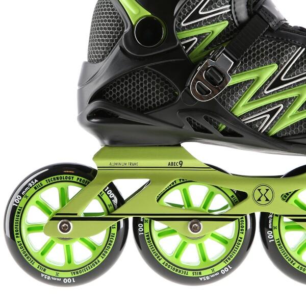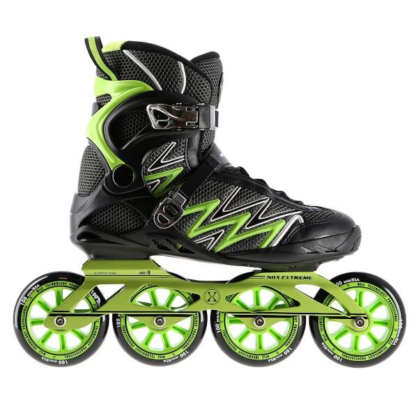 Kolečkové brusle NILS Extreme NA8660 jsou určeny k rekreační jízdě středně pokročilých bruslařů po rovných a hladkých stezkách, jako například po asfaltu. Lehká a odolná bota je vyrobena z kombinace síťoviny MESH a pěny EVA, korpus je vybaven ventilačními otvory, tyto vlastnosti zaručují prodyšnost boty, snižují pocení nohy a předchází tak vlhnutí vložky. Systém ventilace a tvarovaná stélka boty tak přímo ovlivňují zvýšení uživatelského komfortu. Skelet modelu NA8660 je vyroben z polypropylenu, který je velice odolný a vydrží i ty nejtvrdší pády, zároveň stabilizuje chodidlo v oblasti kotníku. Bezpečnost brusle zvyšuje zapínání pomocí dvojice přezek a šněrování. Velká kolečka s tvrdostí 85A jsou uložena v hliníkové liště vyrobené precizní CNC technologií, dobře přiléhají k podkladu a částečně pohlcují nervnosti. Model NA8660 je osazen ložisky ABEC 9, která se vyznačují precizním zpracováním a nízkým odporem, kdy jízda má dobrou setrvačnost a na bruslích tak lze dosáhnout vysoké rychlosti, nebo urazit dlouhou vzdálenost bez vynaložení zbytečné síly. Brusle nemají brzdu.