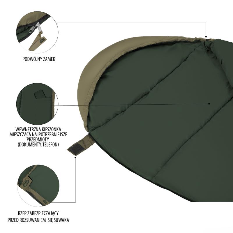 Lehký mumie spací pytel s kvalitní polyesterovou výplní a zateplenou kapucí pro pohodlné spaní při teplotách od 10 °C do -5 °C. zobrazit celý popis