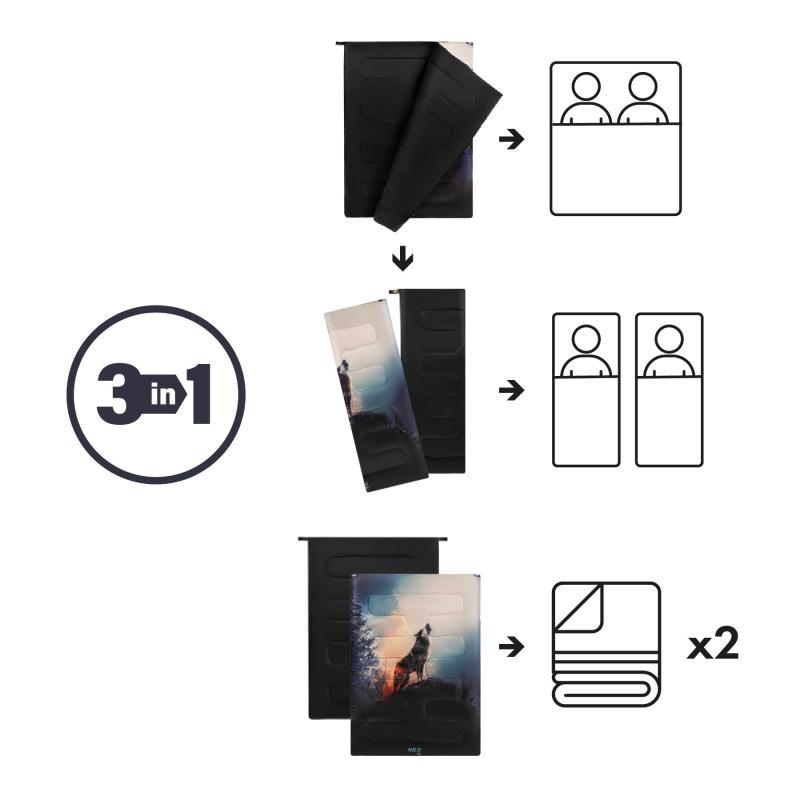 Spací pytel NC3601 od společnosti NILS Camp je jedinečný model navržený pro maximální funkčnost a pohodlí během kempování, stanování nebo přenocování v přírodě. Jeho konstrukce umožňuje použití ve třech různých variantách - jako dvojitý spací pytel, dva samostatné spací pytle nebo dvě nezávislé přikrývky. Toto řešení je ideální jak pro páry, tak pro sólo cestovatele. Systém zipů umožňuje spací pytle snadno a rychle oddělit nebo spojit, což poskytuje velkou volnost při používání a umožňuje přizpůsobit jej každé situaci.