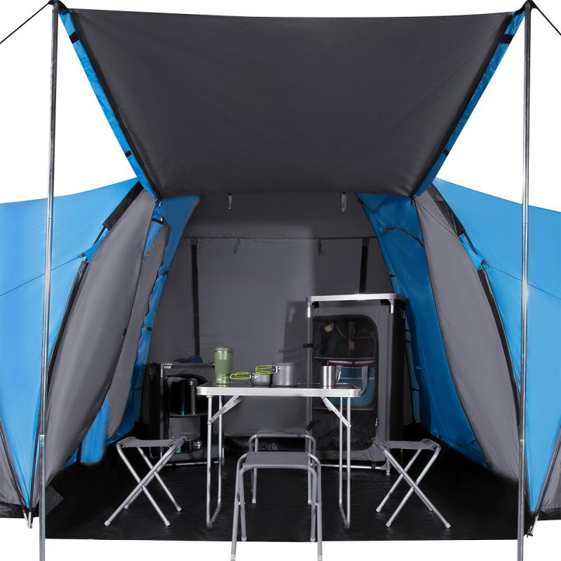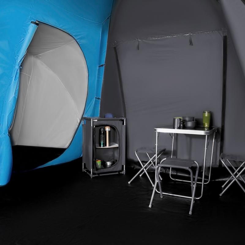 Highland nabízí dvě samostatné ložnice, každou pro tři osoby, a velkou předsíň o rozměrech 210 × 210 × 200 cm. To je dostatek prostoru k pohodlnému pobytu uvnitř stanu – ať už odpočíváte, nebo se schováváte před deštěm.