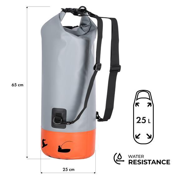 Vak je vyroben z odolné směsi PVC 500D a polyesteru, která chrání obsah před vlhkostí, blátem i nepříznivými povětrnostními podmínkami. Je to ideální volba, pokud chcete mít jistotu, že vaše oblečení, elektronika nebo dokumenty zůstanou suché i v extrémních situacích.