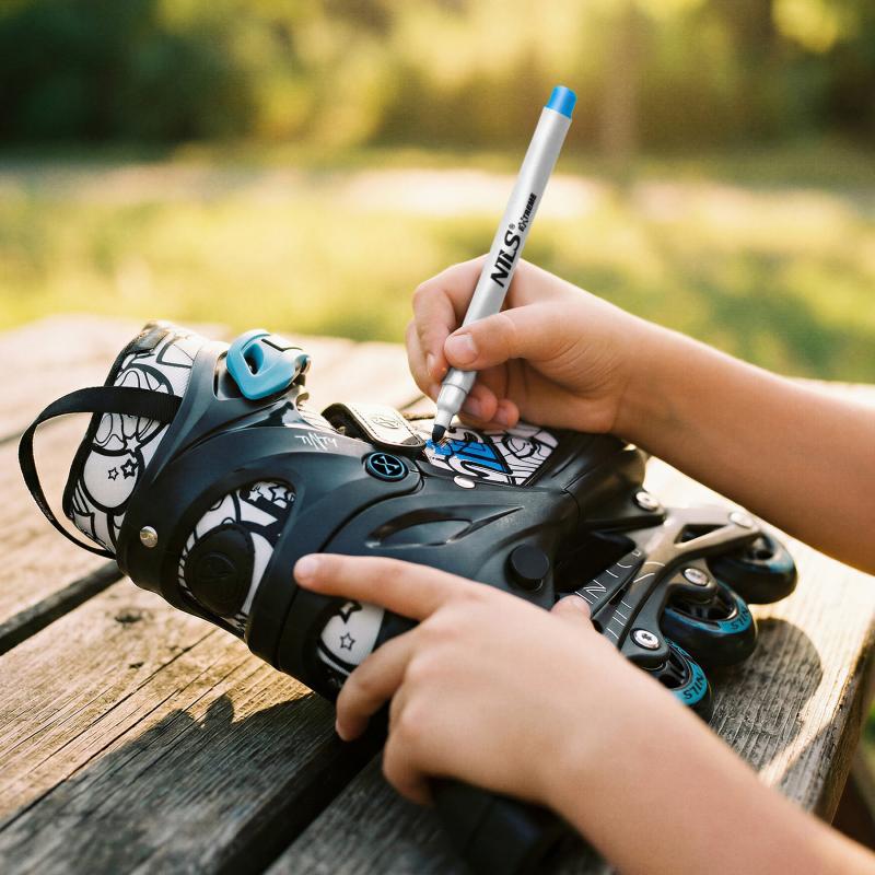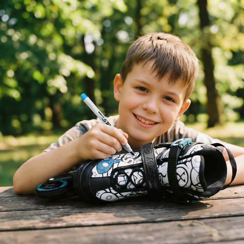 Model TINTY není pouze funkční, ale i zábavný. V balení najdete 7 permanentních fixů, díky kterým si dítě může vybarvit vzor na botě a vytvořit si tak jedinečný vzhled. Takový přístup podporuje kreativitu a zvyšuje zájem o učení bruslení.
