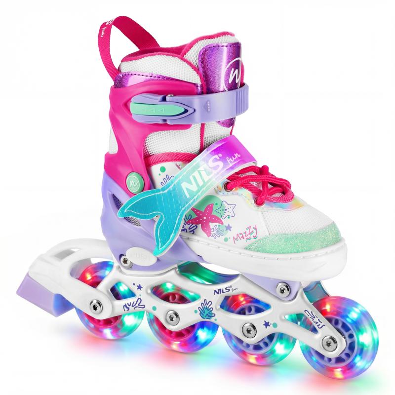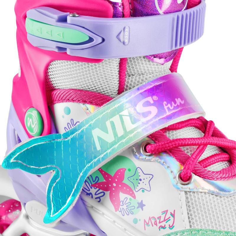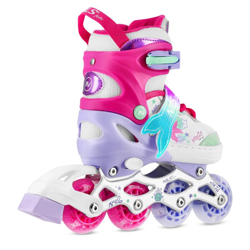 NH18150 MAZZY značky NILS Fun je jedinečný dětský set 4v1, který spojuje funkčnost, bezpečnost a atraktivní pohádkový design inspirovaný podmořským světem. Jeden produkt nabízí hned čtyři konfigurace – kolečkové brusle, lední brusle, quad brusle a 2+1+1 pro začátečníky – a je tak ideální pro celoroční využití.
