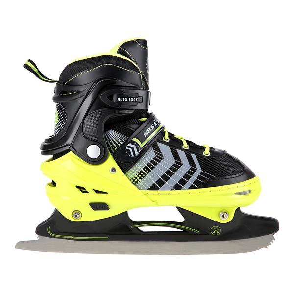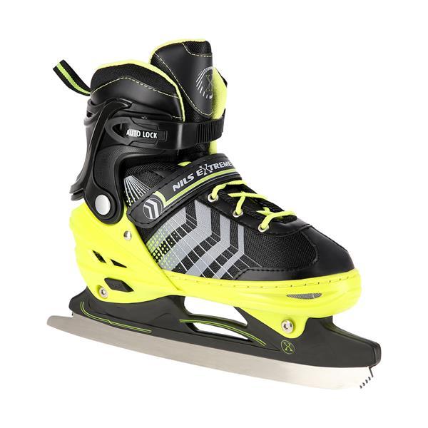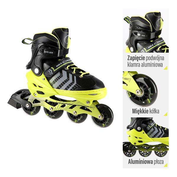 Univerzálne detské korčule s nastaviteľnou veľkosťou a vymeniteľným nožom na ľad pre začiatočníkov aj pokročilých.NILS Extreme NH18192 sú kolieskové korčule 4v1 s vymeniteľným nožom na ľad, ktoré sú určené pre začiatočníkov a stredne pokročilých používateľov. Hliníkový podvozok je osadený mäkkými PU kolieskami s ložiskami ABEC7 pre svižnú jazdu. Vonkajšia topánka je pomocou stlačenia tlačidla nastaviteľná do štyroch veľkostí, toto riešenie umožňuje precízne prispôsobenie veľkosti podľa aktuálnych potrieb alebo sa používa ako "rastúca topánka", ktorá "rastie" spolu s nohou dieťaťa. Na špičke sú ventilačné otvory pre maximálnu priedušnosť. Vnútorná topánka je vyrobená z kombinácie semišu, sieťoviny MESH, EVA a peny s vysokou hustotou. Zapínanie je riešené klasickou trojkombináciou - šnurovanie, remienok na suchý zips a dvojsekčná pracka. Súčasťou balenia je sada skrutiek a podložiek pre prestavbu podvozku do konfigurácie 2+1 a 2+2 a pár nožov na ľad, ktoré sú vyrobené z nehrdzavejúcej ocele s vysokým podielom uhlíka.