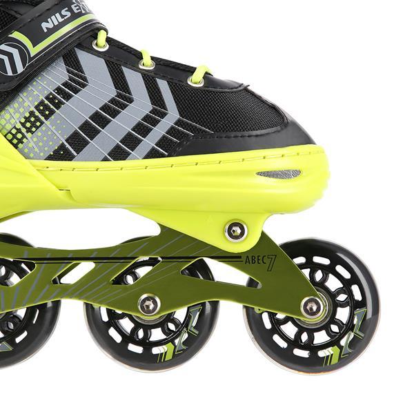 NILS Extreme NH18192 sú kolieskové korčule 4v1 s vymeniteľným nožom na ľad, ktoré sú určené pre začiatočníkov a stredne pokročilých používateľov. Hliníkový podvozok je osadený mäkkými PU kolieskami s ložiskami ABEC7 pre svižnú jazdu. Vonkajšia topánka je pomocou stlačenia tlačidla nastaviteľná do štyroch veľkostí, toto riešenie umožňuje precízne prispôsobenie veľkosti podľa aktuálnych potrieb alebo sa používa ako "rastúca topánka", ktorá "rastie" spolu s nohou dieťaťa. Na špičke sú ventilačné otvory pre maximálnu priedušnosť. Vnútorná topánka je vyrobená z kombinácie semišu, sieťoviny MESH, EVA a peny s vysokou hustotou. Zapínanie je riešené klasickou trojkombináciou - šnurovanie, remienok na suchý zips a dvojsekčná pracka. Súčasťou balenia je sada skrutiek a podložiek pre prestavbu podvozku do konfigurácie 2+1 a 2+2 a pár nožov na ľad, ktoré sú vyrobené z nehrdzavejúcej ocele s vysokým podielom uhlíka.