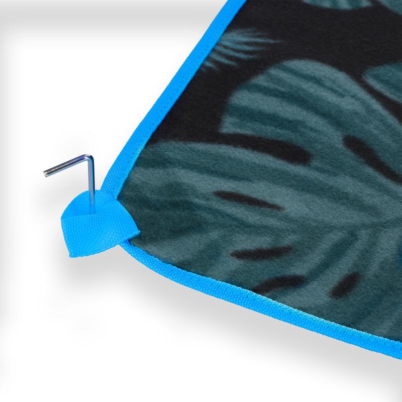 V každom rohu deky sa nachádza praktické očko na pripevnenie deky k podkladu pomocou stanových kolíkov, ktoré sú súčasťou balenia, deka sa potom neshrňuje a aj vo vetre leží na svojom mieste.