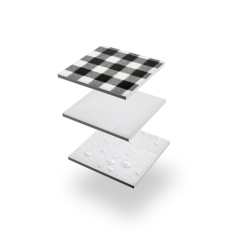 NC2311 je vyrobena ze tří vrstev. Vrchní vrstvu tvoří na dotek příjemný fleece, střední vrstvu tenká pěna a spodní vrstvu polyethylenová fólie s hliníkovým zátěrem, který účinně chrání před chladem a vlhkou zemí. Díky tomu je deka ideální i na chladnějším nebo mokrém podkladu a zajišťuje pohodlí po celý den.