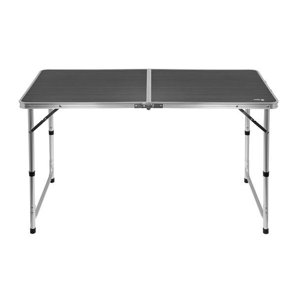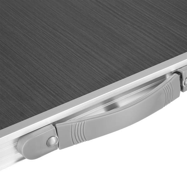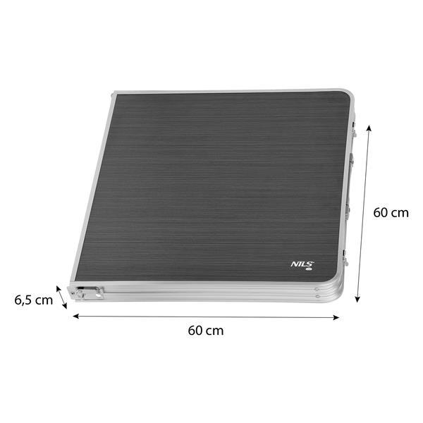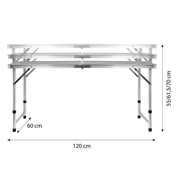 Stôl má dosku o rozmeroch 120 x 60 cm, ktorá je vyrobená z laminovanej MDF dosky. Pevná, ľahká hliníková konštrukcia zabezpečuje odolnosť a stabilitu. Výšku stola je možné nastaviť v troch úrovniach (55, 61,5 a 70 cm), čo umožňuje pohodlné používanie ako deťom, tak dospelým. Stôl sa jednoducho skladá – po zložení nôh a „preložení“ na polovicu vznikne kompaktný kufrík o rozmeroch 60 x 60 x 6,5 cm. Na boku je praktická rukoväť, ktorá uľahčuje prenášanie celej sady.
