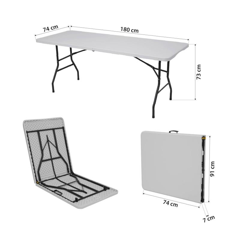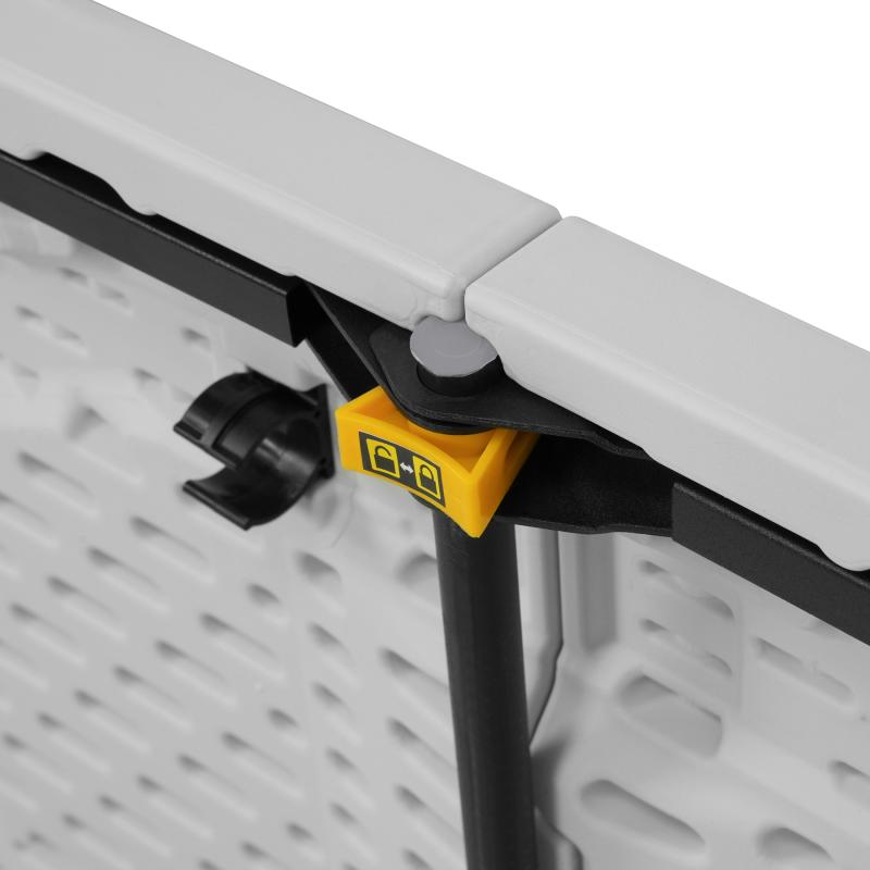 Jednou z hlavních předností modelu NC1618 je jeho robustní a promyšlená konstrukce. Horní deska je vyrobena z odolného PVC s hladkým povrchem, který nejen dobře vypadá, ale je také odolný proti skvrnám, snadno se čistí a odolává povětrnostním vlivům. Zesílený ocelový rám zajišťuje stabilitu stolu i při větším zatížení. Maximální nosnost až 150 kg umožňuje stůl bezpečně používat při servírování jídla, ukládání nádobí nebo rozestavování vybavení na akcích.