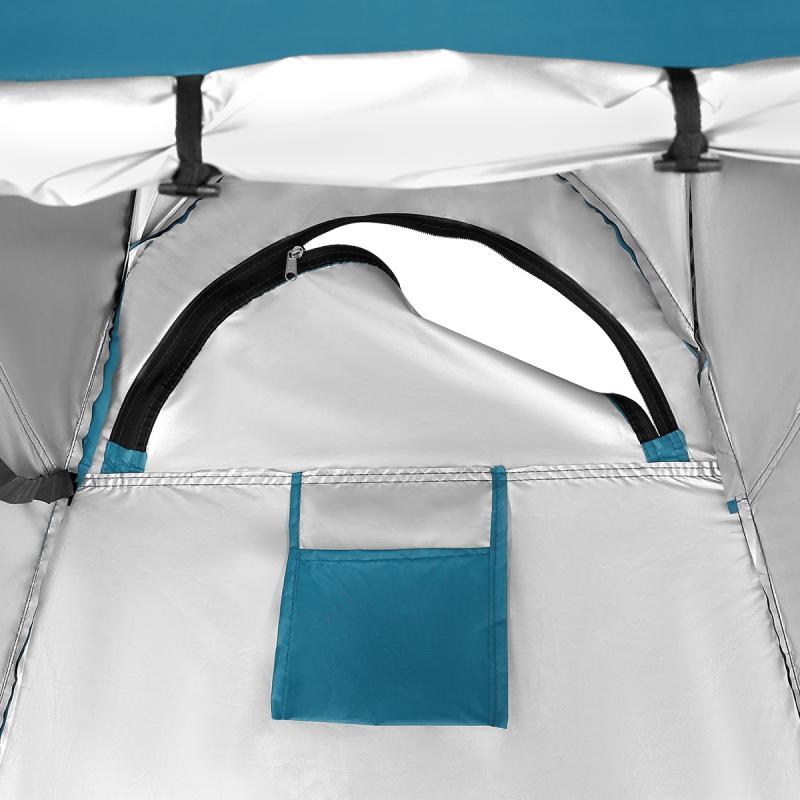 Model NC1706 má široký vstup uzavíratelný zipem, který lze pohodlně srolovat. Uvnitř jsou dva další otvory na zip – boční okno a střešní otvor, který umožňuje například instalaci turistické sprchy. Převlékárna je také vybavena vnitřní kapsou na drobnosti a páskem na zavěšení oblečení nebo ručníku. Kabina nemá podlážku a tak může voda ze sprchy odtékat ven.