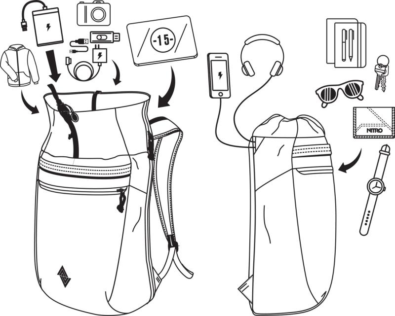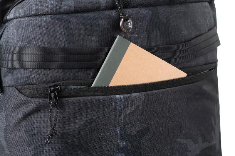 Batoh s horním stahovacím uzavíráním, bočním přístupem na zip, kapsou na 15" laptop, přední kapsou na zip, vnitřní kapsou na zip a malým organizerem na drobnosti. Popruhy jsou ergonomické, polstrované a nastavitelné, spojené hrudním pásem. Měkký zádový panel je polstrovaný a odvětraný.