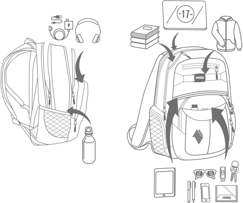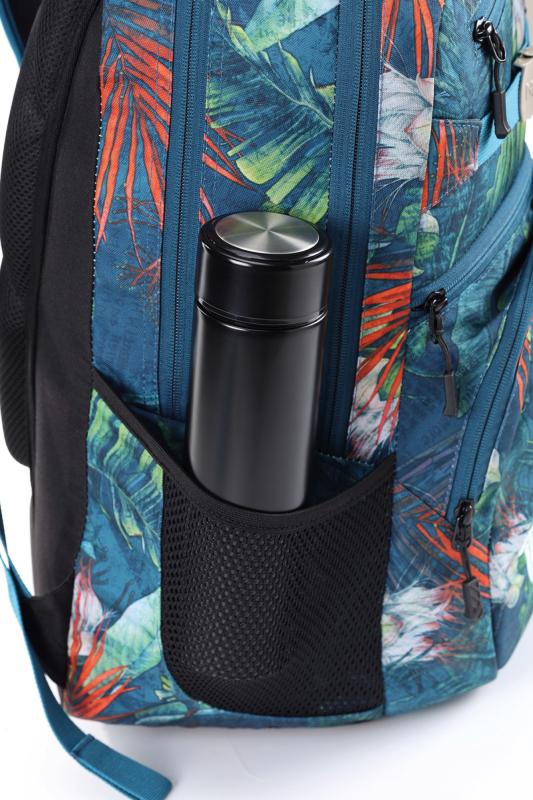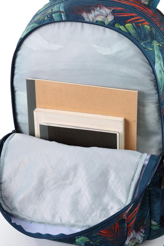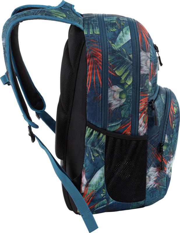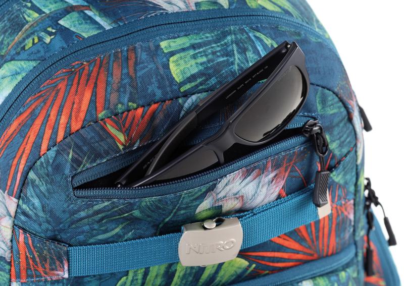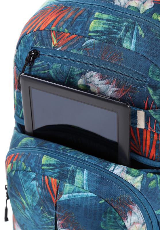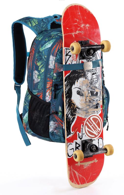 Fleecem vystlaná kapsa na brýle a podobně choulostivé věci, dvě hlavní prostorná oddělení, kapsa na tablet, vypolstrovaná kapsa na 17" notebook, popruh na nesení skateboardu, postranní kapsa na zip, postranní síťovinová kapsa na lahev. Objem 37 l. Rozměry přibližně 52 x 38 x 23 cm. Hmotnost 980 g.Doplňující informace: