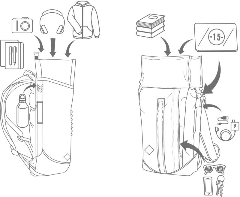 Středně velký městský batoh s rolovacím uzavíránímVypolstrovaná kapsa na 15" notebook s bočním vstupem, rolovací uzavírání na kovový háček, přední kapsa s organizerem, polstrované popruhy s hrudní pásem, měkké síťovinové polstrování zad. Popruhy jdou přitáhnout k batohu aby neplandaly při nošení za boční ucho. Objem 28 l. Rozměry přibližně 47 x 30 x 12 cm, hmotnost cca 900 g.