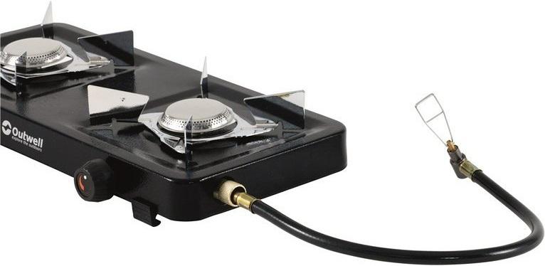 -kompaktný prenosný plynový varič v elegantnom čiernom prevedení určený pre vyznávačov kempingu, táborenia alebo na použitie na chate-stabilná konštrukcia s dvoma horákmi s možnosťou regulácie výkonu a vysokým tepelným výkonom