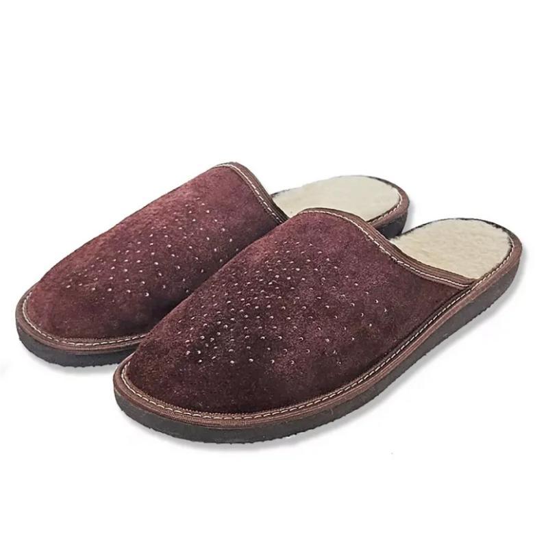 Hnědá semišová kůže tvoří svrchní část pantoflí a dodává jim elegantní a přirozený vzhled, který se hodí do každého interiéru. Tento materiál je zároveň odolný a příjemný na dotek.