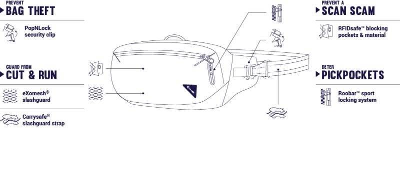 PopNLock bezpečnostná pracka rýchlo a spoľahlivo odopne a zamkne popruh. eXomesh® skrytá oceľová sieť chráni proti prestrihnutiu.Carrysafe® popruhy vystužené dvoma oceľovými lankami. RFIDsafe® kapsa chránia proti zneužitiu kariet a dokladov. Roobar® Sport zamykací systém zipsov.