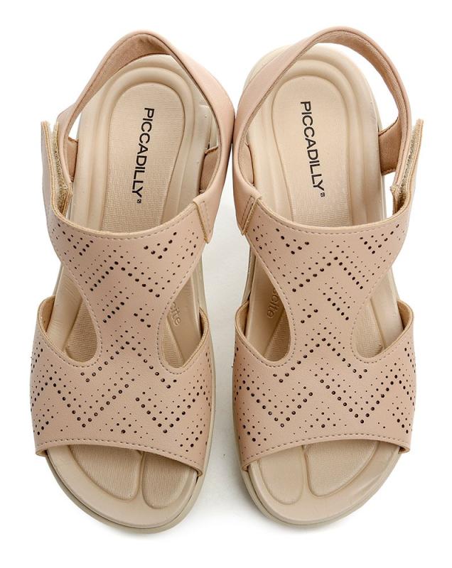 Táto dámska letná obuv ponúka stabilný nízky klin a otvorenú konštrukciu s voľnou špičkou i pätou, čo zabezpečuje dostatočné vetranie a pohodlie v teplých dňoch.\n\nSandále pochádzajú od brazílskej značky Piccadilly a sú vyrobené z kvalitného syntetického materiálu, ktorý je odolný a ľahko udržiavateľný. Vnútorná časť je vybavená polstrovanou textilnou podšívkou, ktorá príjemne obopína nohu a prispieva k celkovému komfortu.\n\nSUPER SHAPE technológia využíva špeciálne trojrozmerné meranie chodidla, vďaka ktorému majú topánky optimálny tvar prispôsobený nohe, čo významne zlepšuje pohodlie pri chôdzi. Podšívky sú navyše vybavené špeciálnou penou, ktorá sa prispôsobuje tvaru nohy a zvyšuje tak komfort nosenia.\n\nEXCLUSIVE INSOLES znamenajú, že všetky modely Piccadilly majú gélové opätky, ktoré znižujú tlak na päty a predchádzajú ich podráždeniu alebo poraneniu. U modelov na vyšších podpätkoch sú navyše gélové vložky umiestnené v oblasti brušiek prstov, čo zabezpečuje pohodlnú chôdzu aj u módnych variantov.\n\nHmotnosť jedného páru je 430 g, čo prispieva k ľahkosti a ľahkej nositeľnosti počas celého dňa.\n\nTechnické parametre:\n• Farba: béžová\n• Vnútorný materiál: syntetika\n• Vonkajší materiál: syntetika\n• Výška topánky: 10 cm\n• Výška opätku: 4 cm\n• Šírka: H (širšia varianta)\n\nTieto sandále sú vhodné pre ženy hľadajúce pohodlnú, zdravotne prívetivú obuv na leto, ktorá poskytuje dostatok opory a zároveň štýlový vzhľad. Vďaka prepracovanému tvaru a použitým materiálom sú ideálne pre každodenné nosenie i dlhšie prechádzky.\n\nAk hľadáte sandále, ktoré kombinujú komfort s praktickým dizajnom, tento model splní vaše očakávania a prinesie príjemný pocit pri každom kroku.