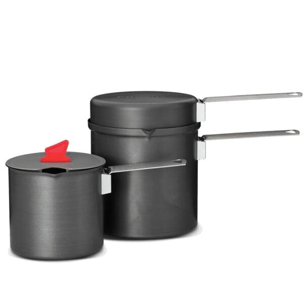 Táto sada outdoorového riadu ponúka dva hrnce o objeme 0,6 l a 1,0 l, vyrobené z tvrdeného eloxovaného hliníka s keramickým nepriľnavým povrchom, ktorý uľahčuje varenie aj čistenie. Menší hrniec je vybavený plastovou pokrievkou s cedníkom, čo umožňuje pohodlné scedenie vody, zatiaľ čo väčší hrniec má pokrievku s keramickým povrchom, ktorú možno využiť ako minimalistickú panvicu.