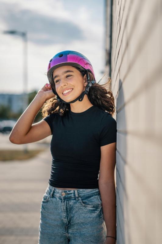 Lehká helma s nastavitelnou velikostí a 11 větracími otvory nabízí spolehlivou ochranu při jízdě na koloběžce, skateboardu nebo inline bruslích.Tato helma je vhodná pro různé volnočasové aktivity jako je jízda na koloběžce, inline bruslení nebo skateboard.