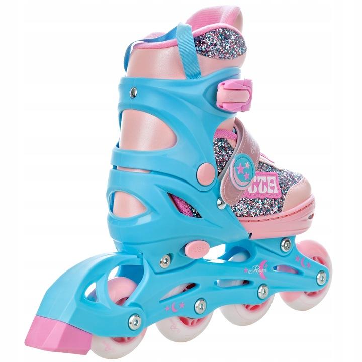 Velikostně nastavitelné (rostoucí) kolečkové dívčí inline brusle. Brusle jde zvětšovat v uvedeném rozsahu velikostí. Balení obsahuje nůž na led, kterým lze zaměnit inline podvozek.• Ložiska: Abec7 Carbon