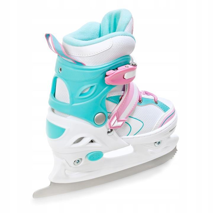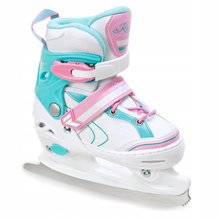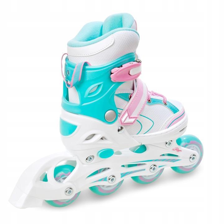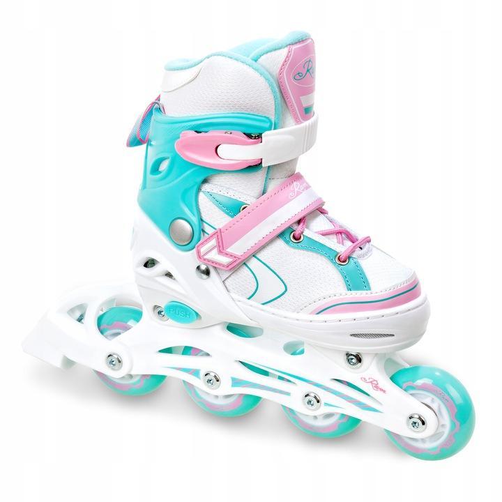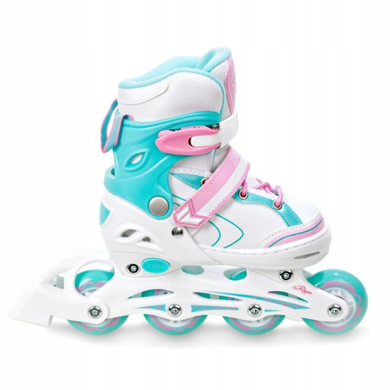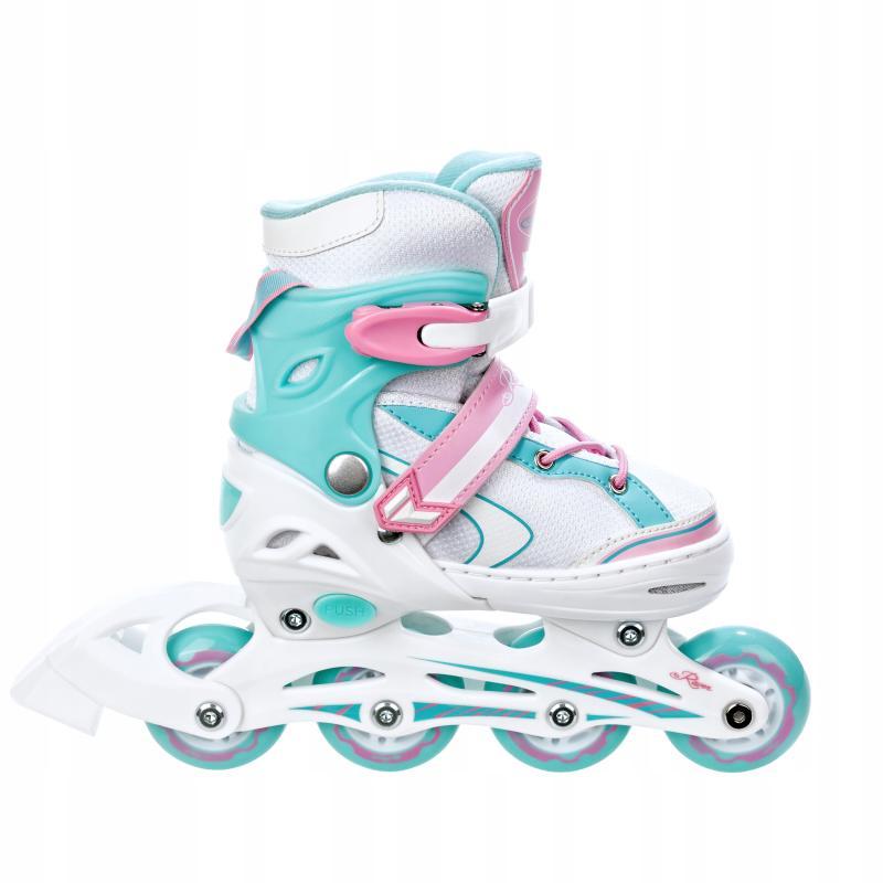 Velikostně nastavitelné (rostoucí) kolečkové dívčí inline brusle. Velikost brusle se nastavuje stisknutím tlačítka nastavovacího mechanismu a vysunutím přední části boty. Balení obsahuje nůž na led, kterým lze zaměnit inline podvozek.