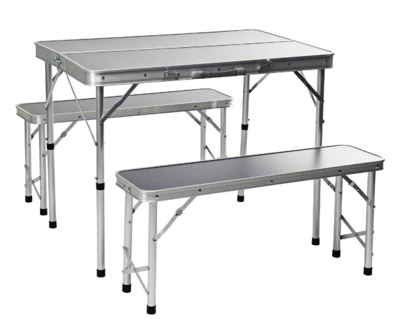 Praktický a odolný kempingový set ideálny pre pikniky, kempovanie alebo záhradné posedenie. Stôl aj lavice majú skladaciu konštrukciu, vďaka ktorej sa ľahko prenášajú a skladujú. MDF doska so sivým prúžkom je vodotesná a hliníkový rám zaisťuje stabilitu a dlhú životnosť.Technické parametre:
