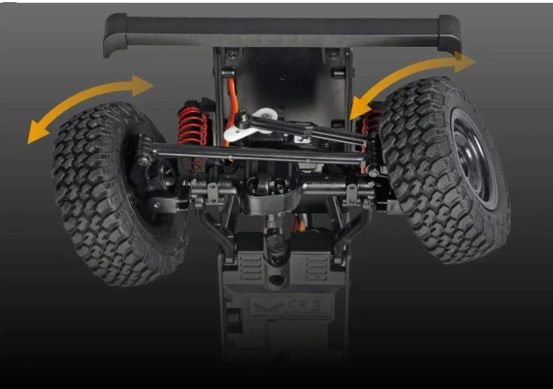 Tento model RC auta ponúka skvelý zážitok z jazdy vďaka pohonu všetkých štyroch kolies a silnému motoru 260, ktorý zvládne aj náročnejší terén vrátane stúpania až 30°. Vďaka robustnému kovovému rámu a pružinovým tlmičom sa podvozok efektívne prispôsobuje nerovnostiam, zatiaľ čo mäkké pneumatiky s hlbokým vzorom zabezpečujú dostatočnú priľnavosť na rôznych povrchoch.