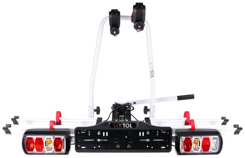 Nosič kol na ťažné zariadenie E-BIKE 2 - 2 elektrobicykle SIXTOLSpoľahlivý nosič kol na upevnenie na guľu ťažného zariadenia E-BIKE 2 pre 2 elektrobicykle. Nosič je vyrobený z ocele a hliníka. Nosič disponuje jednoduchým systémom upevnenia, s naklápaním pre prístup do kufra, s kompletne osvetleným panelom a miestom pre evidenčnú značku vozidla. Upevnenie bicykla do nosiča prebieha bez náradia, vykonáva sa uchytením držiaka na rám a dotiahnutím spon na kolesách, umiestnených na základe. Mechanizmus je uzamykací a nehrozí tak odcudzenie bicykla. Zaistovací koliesko pre upevnenie bicykla je potrebné dôkladne dotiahnuť, aby sa prekonal odpor preklzu v zamknutej polohe. Nosič je vyhotovený z ocele a každá zo základní bicykla je z hliníka. Nosič je vybavený panelom s osvetlením a miestom pre uchytenie evidenčnej značky (EČV). Svetelný panel je pripojený k zásuvke ťažného zariadenia vozidla pomocou 13-pólového konektora a je vybavený kompletnými zadnými svetlami, vrátane osvetlenia EČV. Napriek veľkým rozmerom nosiča je stále umožnený prístup do kufra a to vďaka dômyselnej konštrukcii a možnosti naklápania celého nosiča.