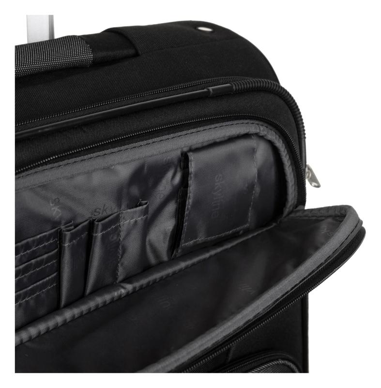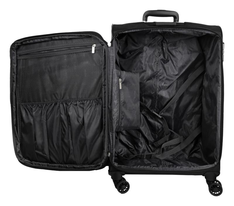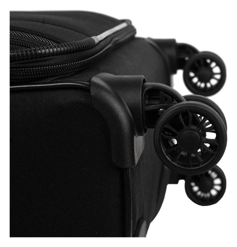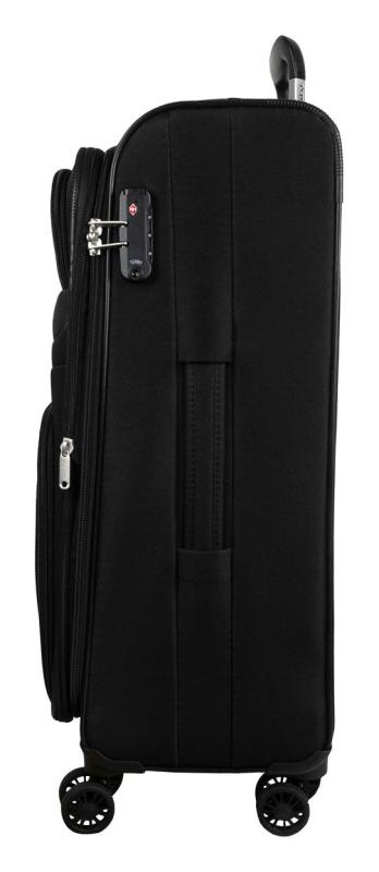 Univerzálny štvorkolesový stredný textilný kufor s integrovaným TSA zámkom, expandérom, menovkou a dvoma prednými vreckami.