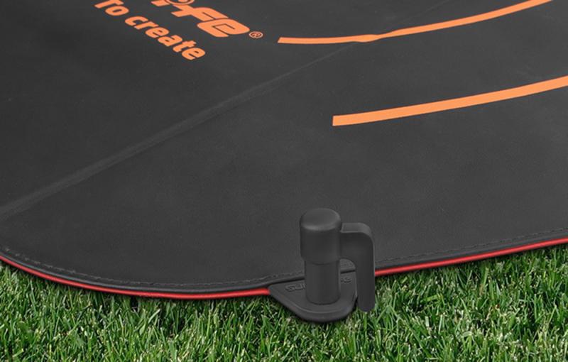 Štyri kolíky zaručujú spoľahlivú stabilizáciu a udržiavajú podložku na určenom mieste. Vďaka tomu sa nemusíte obávať vetra, ktorý sa môže vyskytnúť na otvorenom priestranstve, na pláži alebo na trávnatých plochách. Šesťuholníkový dizajn pristávacej podložky sa dokonale vyznačuje vysokou odolnosťou.